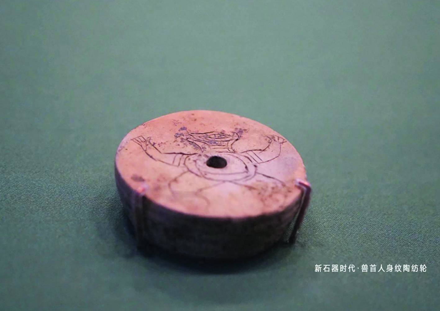 这件陶纺轮直径5.8厘米,厚2厘米,为灰陶质、扁圆形,中间有一孔。侧面装饰三道弦纹。纺轮上浅刻有兽首人身纹饰。兽首侧视,身躯较短,作站立状,四肢张开,似人形,线条简洁流畅,形象栩栩如生。六合区羊角山遗址1988年进行考古发掘,并出土了一批具有较高历史、科学价值的石器、陶器等。