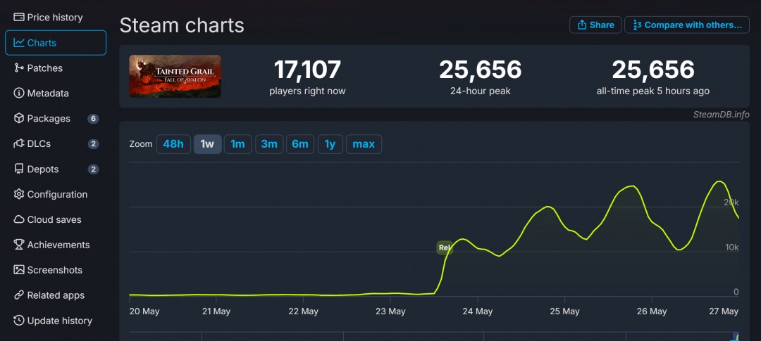 根据SteamDB统计,《污痕圣杯:阿瓦隆的陨落》Steam同时在线峰值超过了2万人,达到了25656人,当前在线17107人。